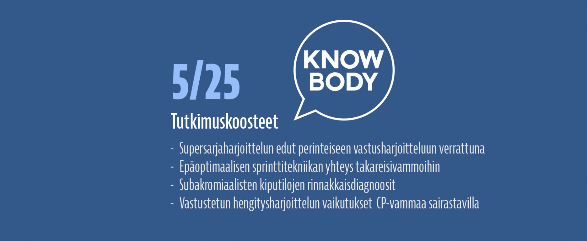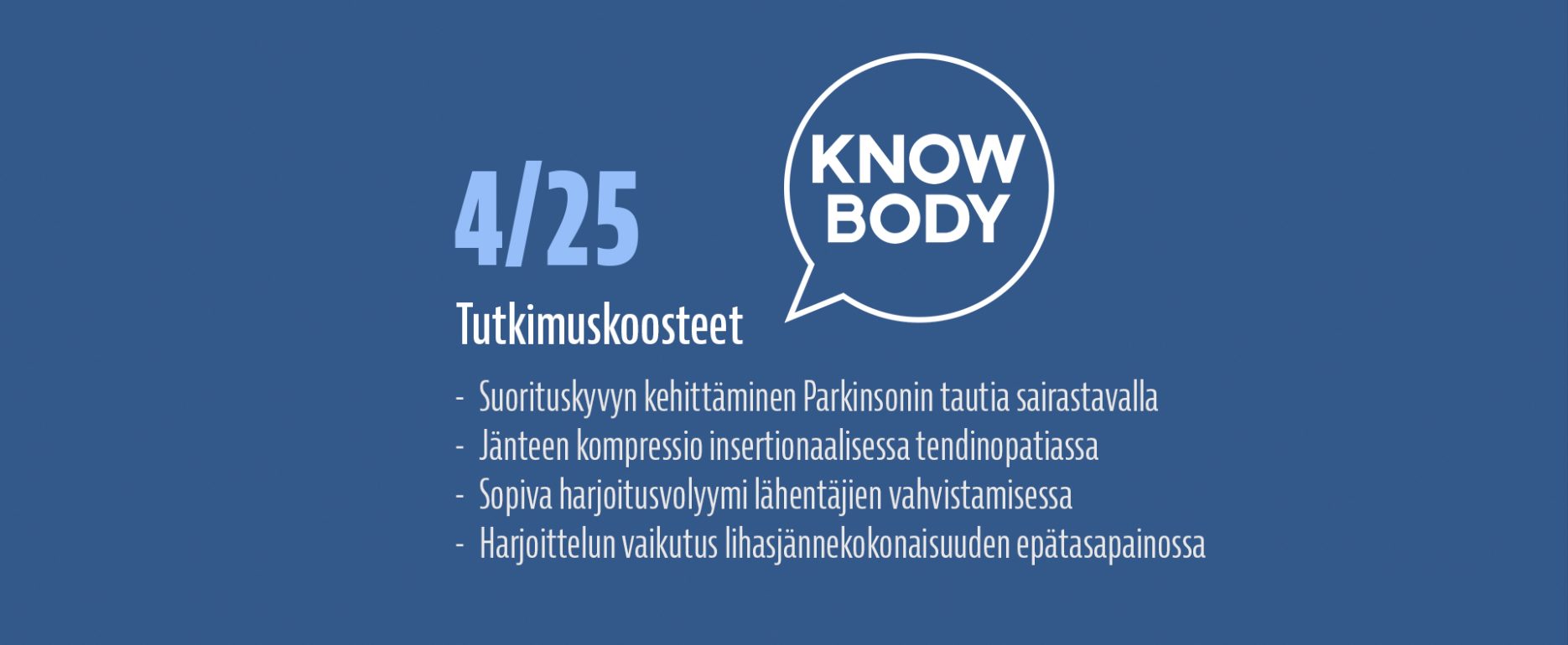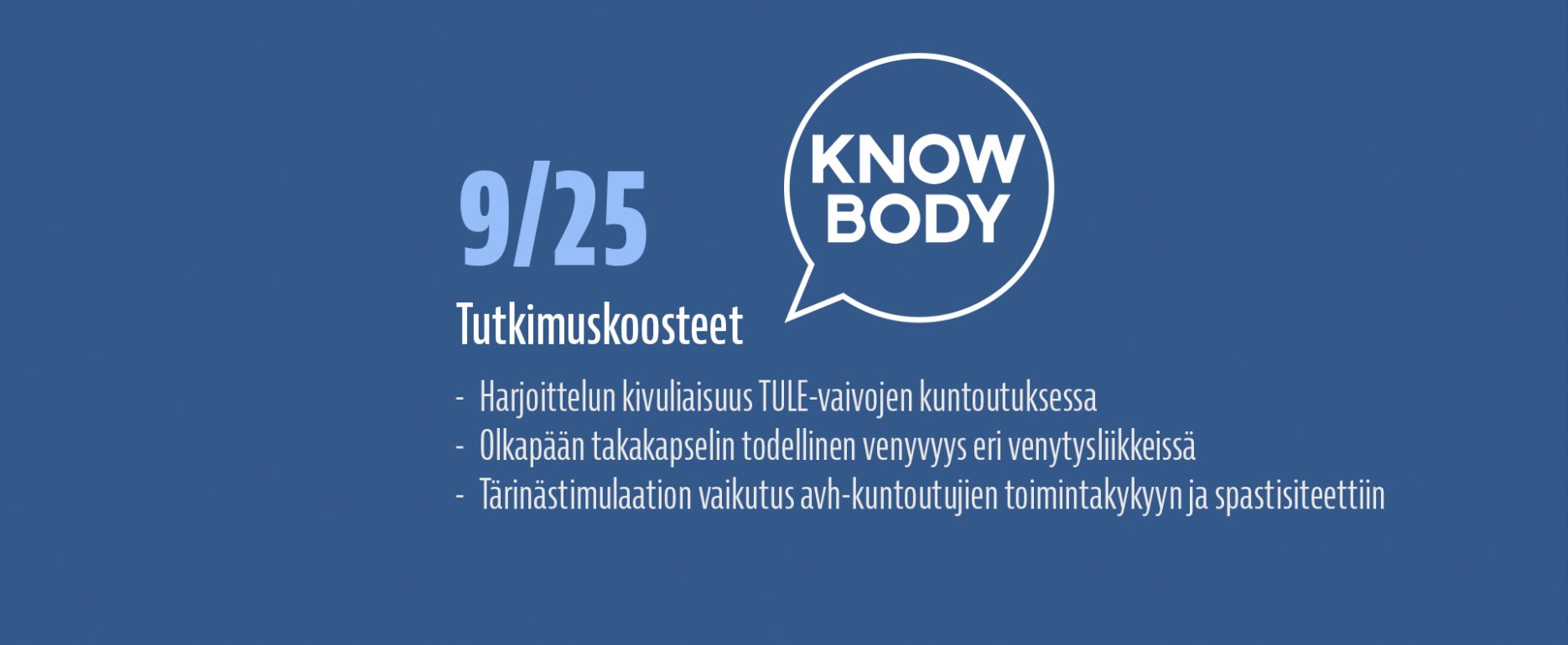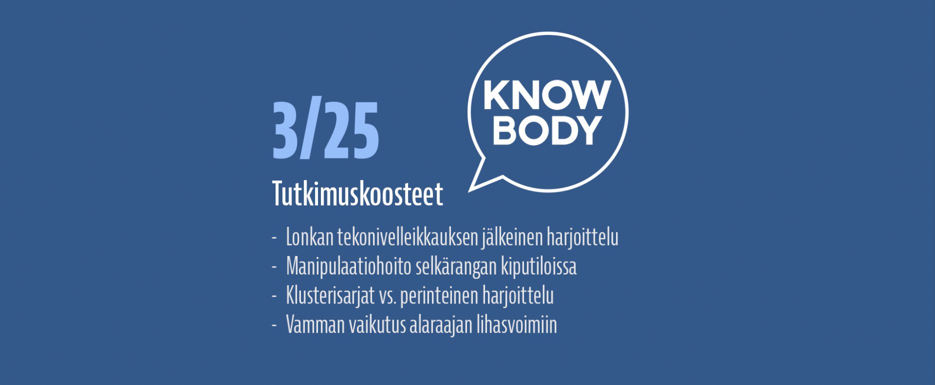 Luen hyvin paljon tieteellisiä tutkimuksia ja olen vuodesta 2017 alkaen kirjoittanut lähes jokaisesta laadukkaasta tutkimuksesta ylös lyhyen suomenkielisen tiivistelmän, jotta löydän nopeasti tutkimusviitteen uudestaan ja jotta voin nopeasti muistella, mitä näyttö eri aiheista sanoo. Näitä tutkimuksia on kertynyt satoja, ja ne ovat luettavissa Knowbodyn tutkimuskoostearkistosta. Koulutustaustani johdosta olen jakanut koosteet kahteen eri luokkaan: Kuntoutukseen sekä Suorituskyvyn kehittämiseen.