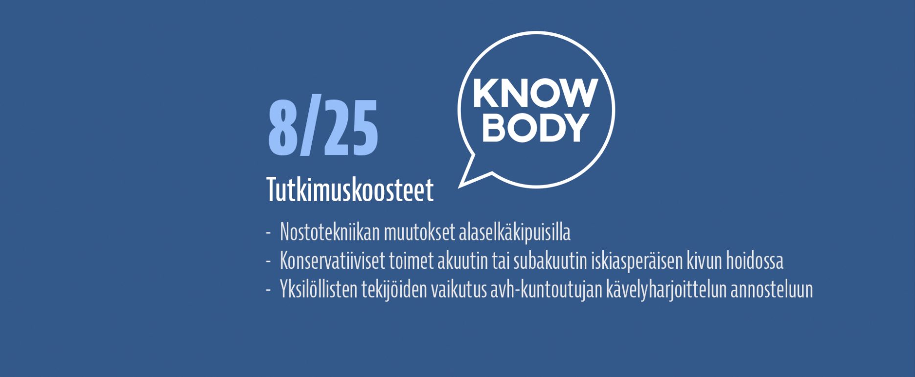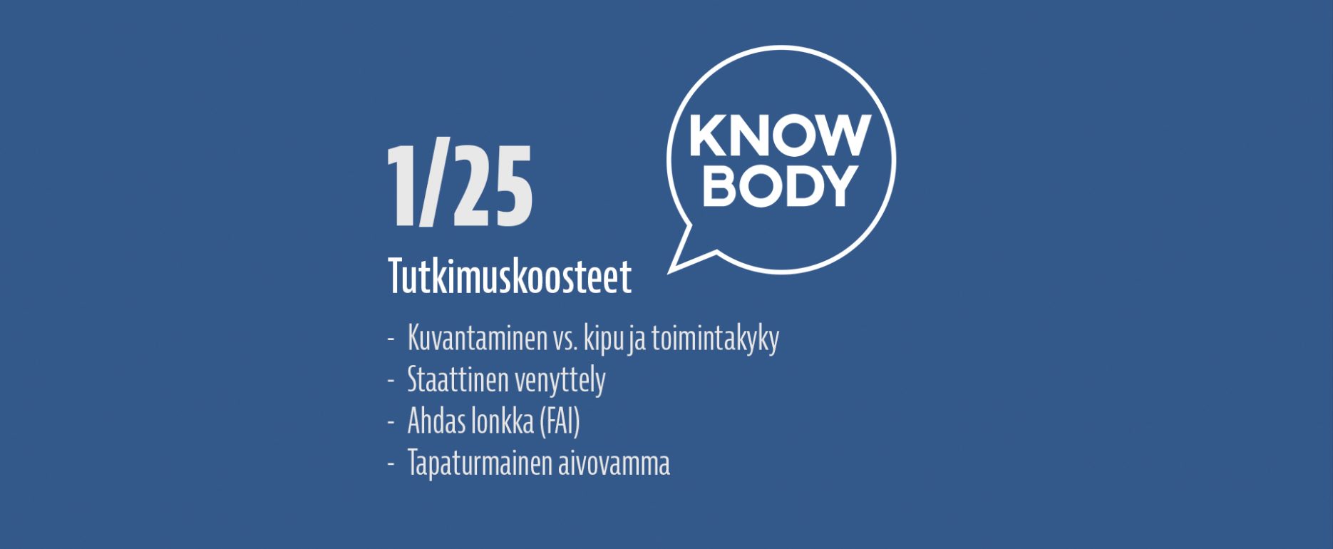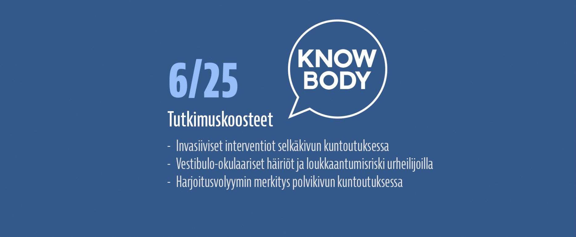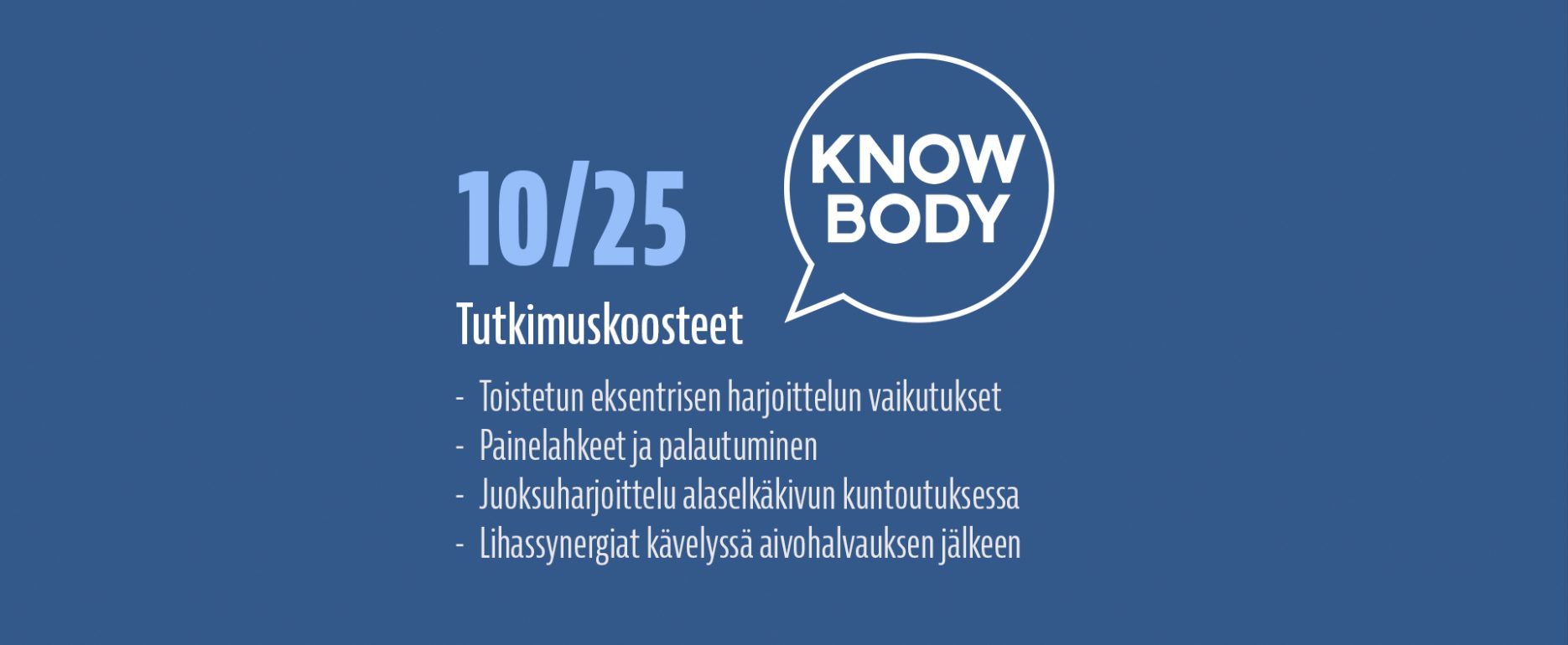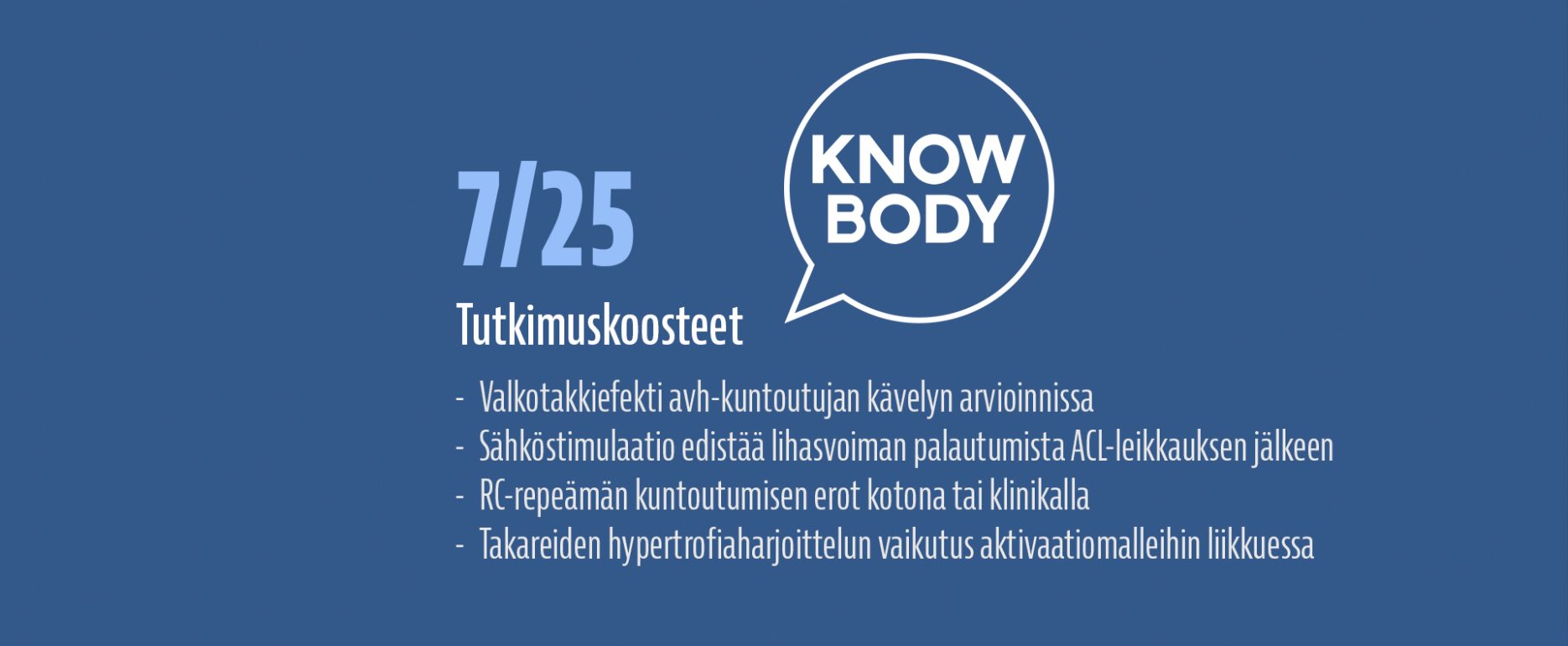 Luen hyvin paljon tieteellisiä tutkimuksia ja olen vuodesta 2017 alkaen kirjoittanut lähes jokaisesta laadukkaasta tutkimuksesta ylös lyhyen suomenkielisen tiivistelmän, jotta löydän nopeasti tutkimusviitteen uudestaan ja jotta voin nopeasti muistella, mitä näyttö eri aiheista sanoo. Näitä tutkimuksia on kertynyt satoja, ja ne ovat luettavissa Knowbodyn tutkimuskoostearkistosta. Koulutustaustani johdosta olen jakanut koosteet kahteen eri luokkaan: Kuntoutukseen sekä Suorituskyvyn kehittämiseen.