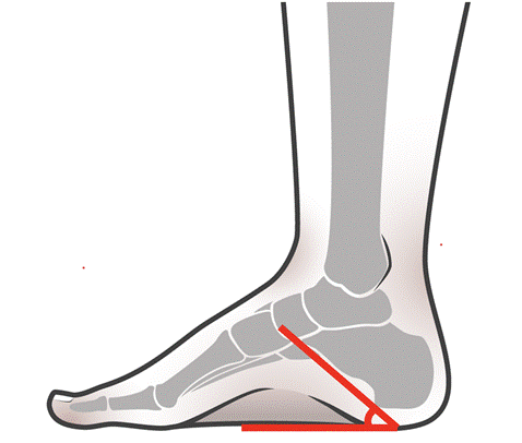 Kuva 2. Calcaneocavukseen on tyypillistä yli 30 asteen kantaluun inklinaatiokulma. Kantaluun inklinaatiokulmaa kutsutaan myös kantaluun nousukulmaksi. Englanninkielisessä kirjallisuudessa siitä käytetään termiä calcaneal pitch. Aste mitataan lateraalisesta kuvantamisesta. Tässä kuvituksessa jalkaa kuvataan mediaalisesti.